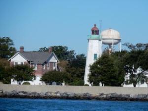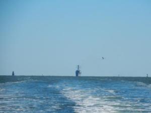 Out on the bay there were lots of boats, most all heading south as it was a beautiful day to be on the water. We passed along Fort Monroe and saw the lighthouse, as well as the Chamberlain (formerly hotel and now senior residential home) that Jeff (“YOLO”) had told us about on Sunday. We saw a bit of Navy traffic as well.