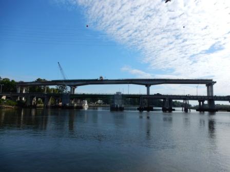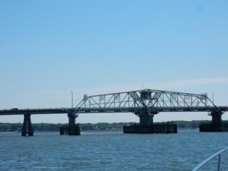 The Skidaway River turns onto the Wilmington River and shortly thereafter we passed by the Savannah Yacht Club (sorry no good picture due to sun in our face) and the large-boat Thunderbolt Marina and shipyard. From here until we get to the Causton-Bluff-Sam Varnedoe Bridge (still undergoing construction) it is a no-wake zone and slow going.  We pass the Hinkley and the Savannah Bend Marinas and the Bonaventure cemetery (made famous in the book “Midnight in the Garden of Good and Evil”) before we could finally go back to our cruising speed.