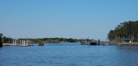 Continuing further north the ICW crosses the South and then the North Santee Rivers and then turns into something like a canal in that it is narrow and a pretty straight shot. To our east is the Tom Yawkee Wildlife Center and its Welcome Center. Here there is a barge (Miss Ellie) that acts like a ferry to transport vehicles across the ICW.