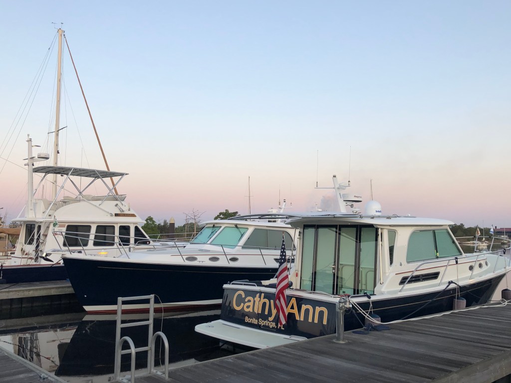 We had been in communication with “Cathy Ann” via the Back Cove/Sabre’s FB group and knew they were in Georgetown; we were anxious to meet face-to-face for the first time. As luck would have it our slip was right next to theirs. After settling the boat, checking into the office, getting showers, and a quick conference call for Denise, we joined them on their boat for happy hour. Jeff & Cathy were very gracious hosts and had also invited another Looper couple Dave & Lisa (“She’s the One”). We had a chance to talk about our mutual looping experiences, friends we have in common (“Donna Pacem” and “Balahula”) and our Back Cove boats.