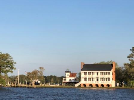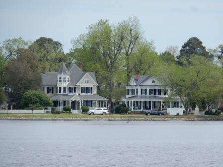 Shortly thereafter, we turned into the Edenton Bay and headed towards the town of Edenton. There are nice homes along the eastern shore of the bay, and as we approached the town breakwater we could see the Roanoke Lighthouse museum that is near the entrance. We entered the breakwater and slowly cruised to our preassigned slip; it was easy to find as the slips are clearly marked and there were no other boats in the marina. The Dockmaster informed us that they are not permitted to assist in the docking and tie-up, but for us to go to the office whenever we were ready to check in.