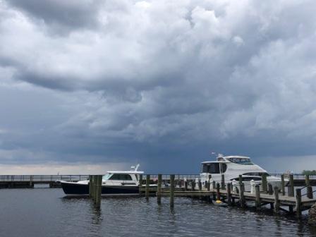 While Denise was getting a tour of the house Mark sent her a text message that a big storm was approaching in less than 10 minutes. So she finished up in the Barker house and made her way back to the boat. We could see the storm coming across the Bay and hunkered down for the inevitable rain and wind. Fortunately, it didn’t last long, but was long enough to keep us from having “docktails” with Ann and Steve.