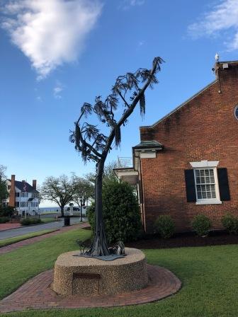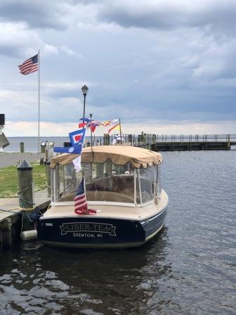 When Mark woke up, Denise mentioned about the town’s weekend activities and the desire to take the 1-hour trolley tour around the historic area. So she went to the Welcome Center which is located across the parking lot from the marina in the historic Penelope Barker House. Here she made reservations for the trolley for tomorrow, and got a brief tour from the very nice docent. She learned about Penelope Barker (a strong woman who outlasted 3 husbands and most of her children), and who led the Edenton Tea Party, which became the first political activity by women in America. You can learn more about her here.