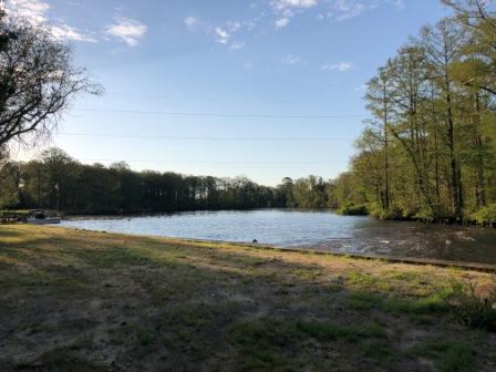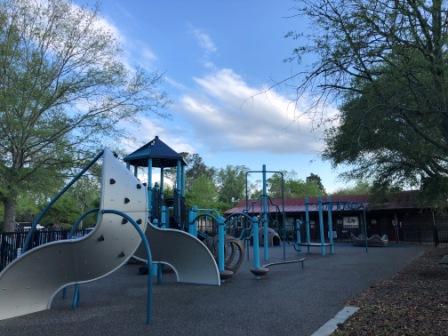 Once we got the boat settled and power hooked up, we ate lunch. We figured if it was our lunch time, it probably would be for the city dockmaster as well. Afterwards we started to walk up to the dockmaster’s office, but he met us at the foot of the dock, near the park that overlooks the marina. He was in a golf cart and was patrolling the park grounds. He had a form on a clipboard and asked us to fill it out right there, which we did. But when Mark mentioned that we were doing the Albemarle Loop and requested the restroom codes, he said we would have to go to back to the office. So we followed him the 100+ yards to the facilities building located by the playground; this also houses the public as well as the security-controlled restrooms for marina guests.