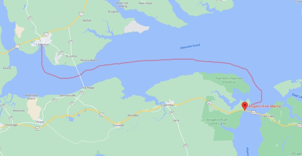 In the morning we left Alligator River marina after all the other boats had left. Several were headed north either via the Dismal Swamp or the Virginia cut, and one headed South to Florida; yes we thought he was going in the wrong direction too. But we were headed west on the Albemarle Sound to the town of Edenton and were hopeful for calmer seas as we headed that way.
