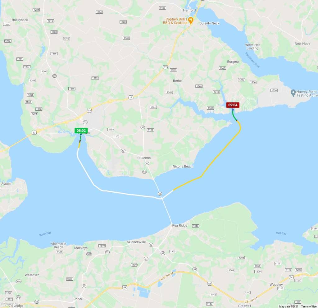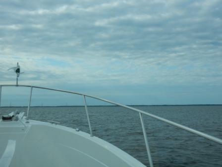 Finally, just after 8:00 we left the town of Edenton and headed out into the bay. It was mostly calm, but we had noticed the wind had actually picked up a little in the last hour. We turned into the Albemarle Sound (AS) and headed east, with the wind and waves on our nose. The forecast called for 1 foot waves, but we noticed they were already 1 to 2 feet and were thankful that we didn’t have far to go. By the time we got to the Albemarle Sound Bridge, we were seeing waves of 2 feet consistently and Denise was wishing we would have left at 7:00 with “Hallelujah”. After all we could have tied up to the fuel dock at AP if we arrived before they opened; we were going there anyway.