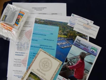 Once we settled the boat, JE (Dockmaster) showed us the golf cart we get to use while here. He then gave us a short tour of where things were located (restrooms, laundry, ice machine, barbeque grill, etc.). He also gave us a welcome packet that included the 2021 Albemarle Loop Brochure (we had an outdated one), a map of the area, menu for the dockside restaurant, discount card, disposable wet wipes, a travel kit, and other brochures about things to do in the area. We truly felt welcome! We then took the cart and drove around to some of the key places in the Plantation so we could get our bearings.