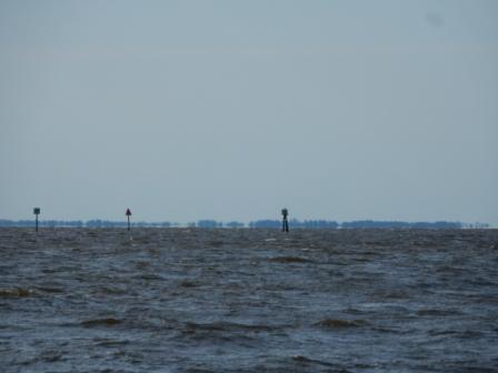 Finally, just after 8:00 we left the town of Edenton and headed out into the bay. It was mostly calm, but we had noticed the wind had actually picked up a little in the last hour. We turned into the Albemarle Sound (AS) and headed east, with the wind and waves on our nose. The forecast called for 1 foot waves, but we noticed they were already 1 to 2 feet and were thankful that we didn’t have far to go. By the time we got to the Albemarle Sound Bridge, we were seeing waves of 2 feet consistently and Denise was wishing we would have left at 7:00 with “Hallelujah”. After all we could have tied up to the fuel dock at AP if we arrived before they opened; we were going there anyway.
