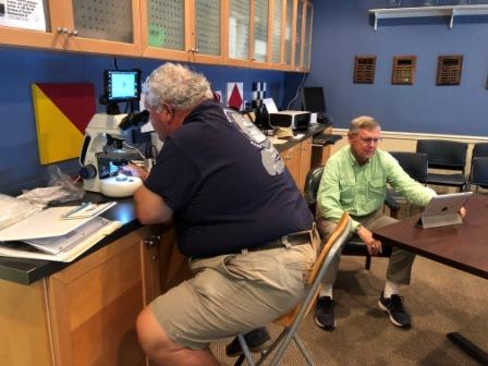 At lunchtime Mark came back to the boat for his usual turkey sandwich and reported that he had company in the Yacht Club in the morning. There were several people who were participating in NOAA research regarding the quality of the water in the sound and creek. More specifically they were taking water samples and checking for nitrogen content in the water, to assess the threat of algae bloom. They were all volunteers, but one was a former NOAA research scientist. After they had taken samples (yes out in the rain), they came back to the Yacht Club and put the samples under their microscopes and recorded all things scientific, before submitting them to NOAA. Fortunately, all was good with no sign of the algae.