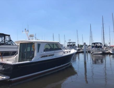 Just after 2:00 pm we made our way through the Alligator River Bridge and continued south, still with wind and waves bumping us along from behind. At one point we got buzzed by a military jet (F35) that was so low and loud Denise thought it was something wrong with the boat. It wasn’t until it hit the afterburners that the sound was recognizable and we could breathe a sigh of relief. Meanwhile, Mark called the Belhaven Marina and secured a reservation for us for the night.