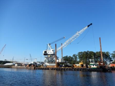 We then crossed over to the eastern shore of the main channel heading into Norfolk where the land blocked the wind and things finally settled down. As usual, there was lots of boat and barge traffic that required Captain Mark to keep a sharp eye and steady hand on the wheel. It was here that we passed the USCG sailing vessel “Eagle”. It was a thrill to see this beautiful ship up close.
