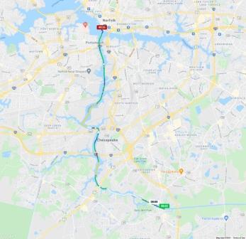 In less than an hour, we left Wormley Creek and headed back out on the York River. It was a little bumpy as we were now facing the wind from the east, and the current was also against us. But it was certainly tolerable and we knew that we only had 1.5 hours left to go before arriving in Norfolk. Along the way down the Bay today we had cancelled our reservations at Cape Charles and Wormley Creek (all without penalty), and made a reservation at Waterside in Norfolk.